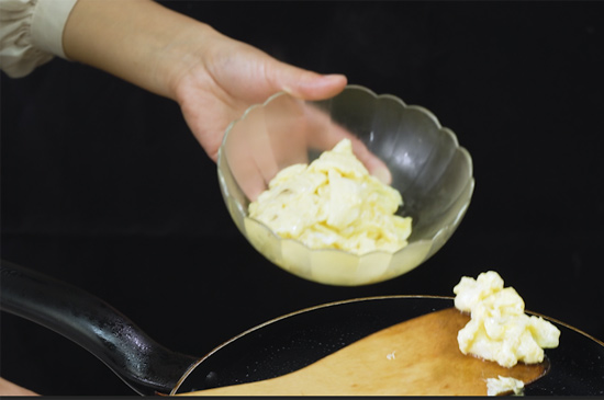 2、起锅烧油,油热后放入蛋液划散炒熟,再盛出装盘备用。