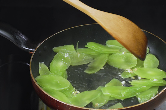 3、另起锅烧油,油热后放入蒜末炒出香味,再倒入莴笋和食盐快炒30分钟。
