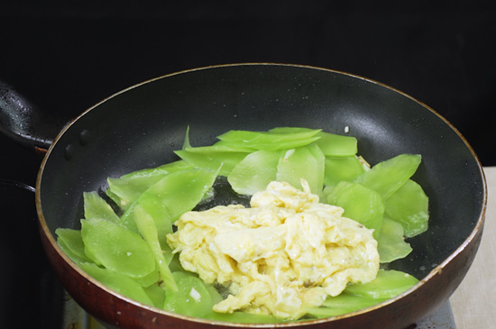 4、最后倒入炒熟的鸡蛋翻炒均匀,美味的莴笋炒蛋就做好了。