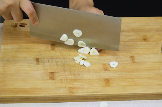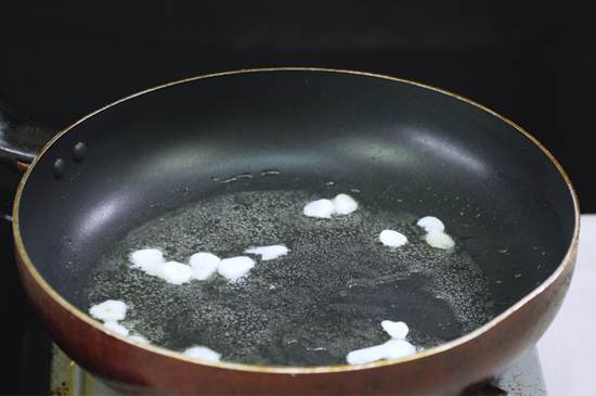2、起锅烧油,油热后放入蒜片炒出香味。