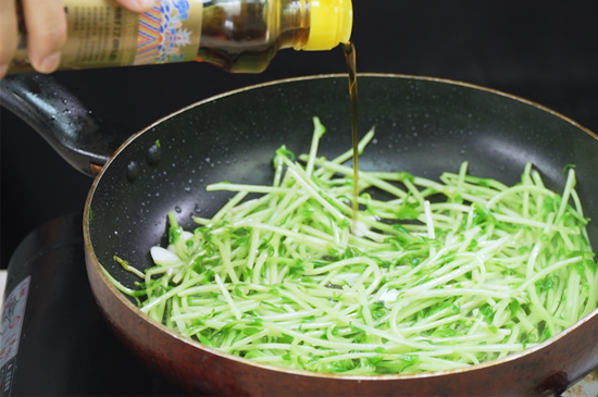 4、最后淋入香油搅拌均匀,美味的蒜香豆苗就做好了。