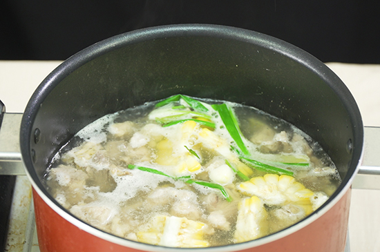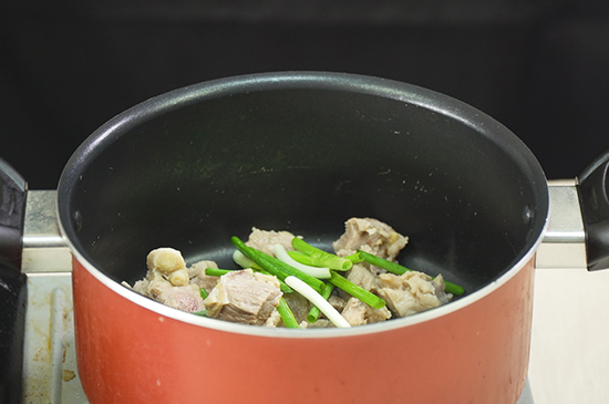 3、焯水的牛肉放入锅内,加入葱段、姜片、蒜、料酒和没过牛肉的开水大火烧开,再加入玉米转小火煮1.5小时。