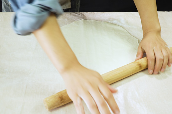 2、取出揉好的面团,用擀面杖把面团压一压,压扁,然后把面片慢慢擀开,直到面皮厚度在1mm左右或者更薄。