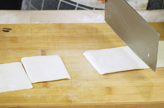 3、最后将擀好的面片切成大约半个手掌大小的面皮,馄饨皮就做好了