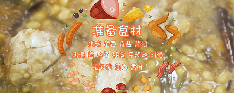 准备食材:猪蹄、黄豆、食盐、酱油、冰糖、姜、八角、桂皮、干辣椒、料酒、植物油、葱白、香叶。