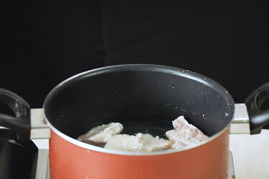 2、起锅加入适量水和猪蹄烧开,猪蹄焯水2~3分钟后,捞出冲洗干净沥干水分备用。