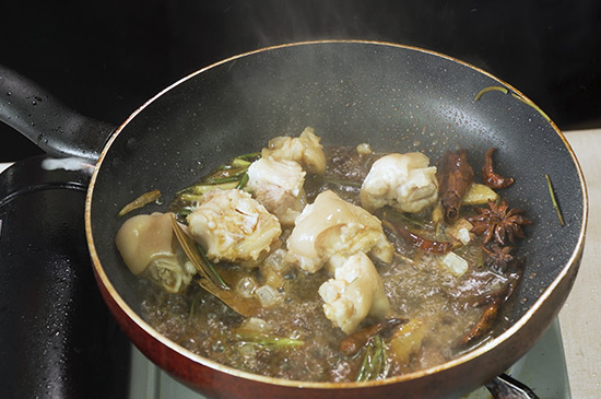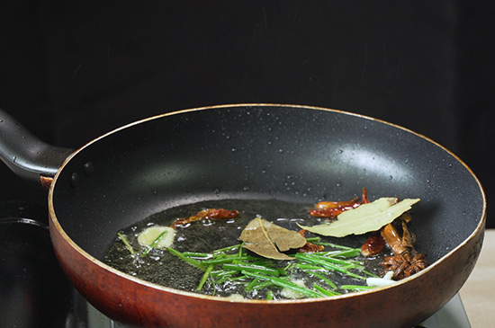 3、起锅烧油,油热后放入姜片、葱段、八角、桂皮、干辣椒和香叶炒出香味。
