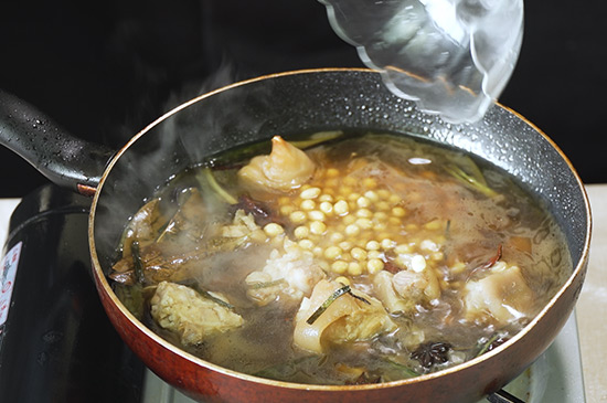 5、加水没过猪蹄大火烧开转小火盖锅炖40分钟,加入适量盐和泡发的黄豆继续炖煮40分钟,美味的黄豆炖猪蹄就做好了。