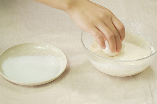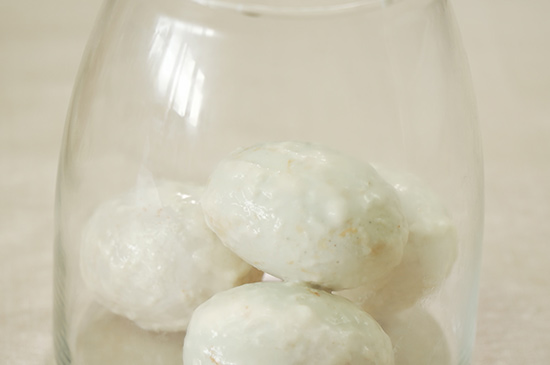 2、鸭蛋洗净晾干后逐个裹满面糊,表面再滚上一层食盐。