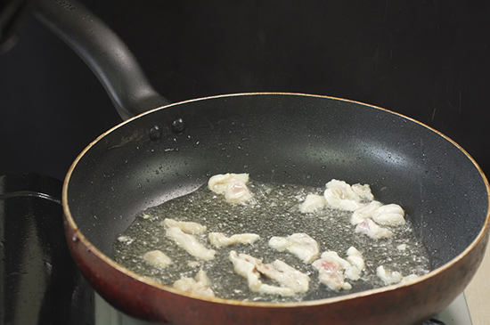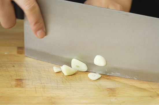 3、起锅烧油,油热后倒入猪肉炒至变色,再依次倒入料酒、生抽、蒜片翻炒均匀。