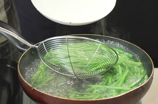 2、起锅烧水,水煮沸后倒入扁豆焯水30秒捞出沥干备用。
