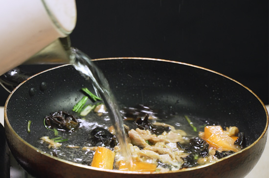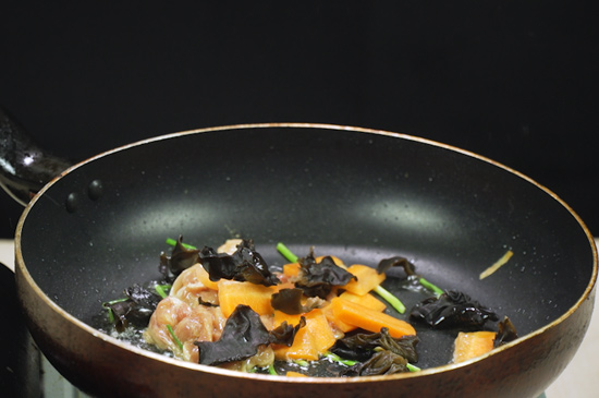 3、起锅烧油,油热后依次放入葱段、肉丝、胡萝卜片和黑木耳煸炒片刻。
