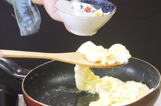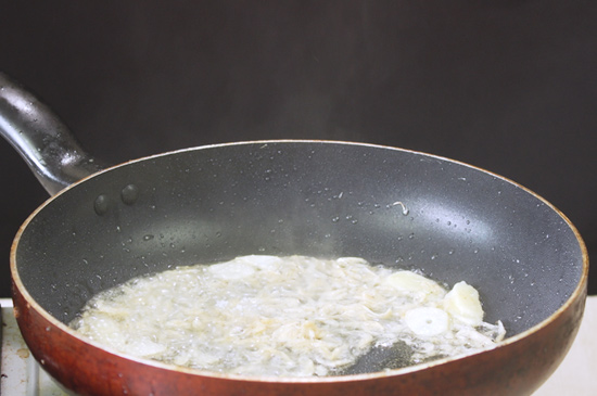 3、起锅烧油,油热后倒入蛋液划散炒熟捞出,再放入蒜、姜大火炒出香味。