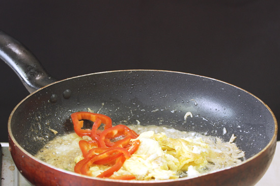 5、最后倒入鸡蛋、红椒、葱段翻炒均匀至红椒断生,美味的炒虾米就做好了。