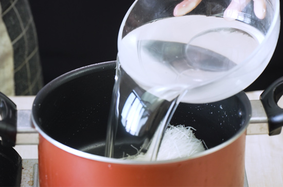 2、粉丝下锅,加冷水和姜丝大火煮沸。