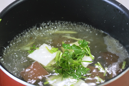 4、最后加入胡椒粉、高汤、豆腐和香菜煮至片刻,美味的鸭血粉丝汤就做好了。