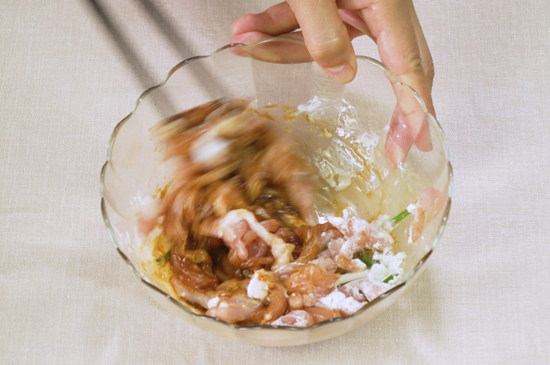 2、小葱切段,里脊肉切丝,葱段和肉丝放入碗内,加入蛋清、淀粉、盐、料酒和老抽搅拌均匀。