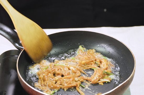 肉丝与葱丝蛋清、淀粉、盐、料酒、老抽搅匀后,倒入油锅内翻炒入味捞出,再倒入甜面酱、细砂糖翻炒均匀,重新倒入豆腐条炒匀,美味的京酱肉丝就完成了。