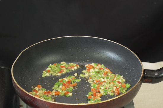 3、锅内倒入香油烧热,再倒入蒜末、青椒和剁椒炒出香味。