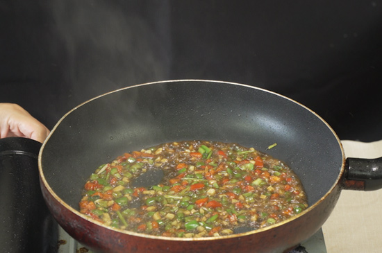 4、往锅内加入料汁,小火煮出香味够关火放量。