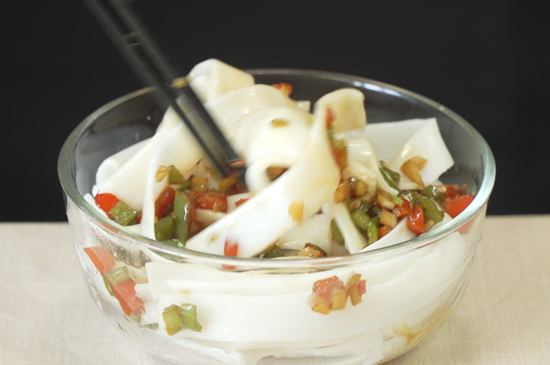 准备食材:凉粉、香油、盐、香醋、生抽、白糖、鸡精、剁椒、蒜、青椒。