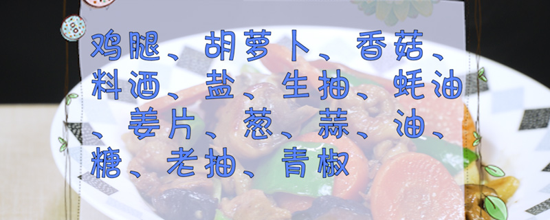 准备食材:鸡腿、胡萝卜、香菇、料酒、盐、生抽、蚝油、姜片、葱、蒜、油、糖、老抽、青椒。