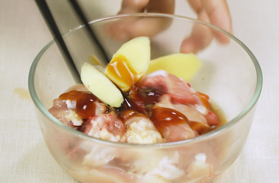 2、鸡腿块加料酒、盐、生抽、蚝油、姜片搅拌均匀,静置腌20分钟。