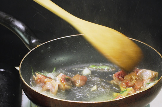 3、起锅烧油,油热后放入葱、姜、蒜炒出香味,再倒入鸡肉翻炒至微微发黄。