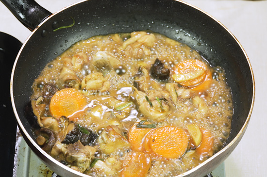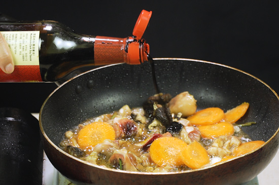 4、倒入胡萝卜、香菇,加入糖、生抽、老抽和蚝油翻炒均匀,再加开水中火焖煮20分钟。