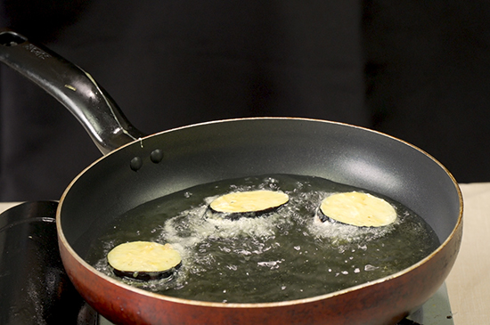 4、起锅烧油,油热后放入茄片炸至两面金黄捞出,倒掉油后,重新放入炸好的茄片煎至表面酥脆。
