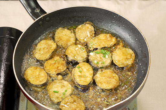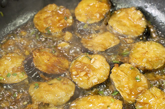 起锅烧油放入处理好的茄片炸至两面金黄捞出后,倒油重新放入炸好的茄片煎至表面酥脆,再放入葱花、蒜末炒出香味,倒入调好的料汁煮1分钟,加入水和面粉中火翻炒收汁,美味的茄盒就完成了。