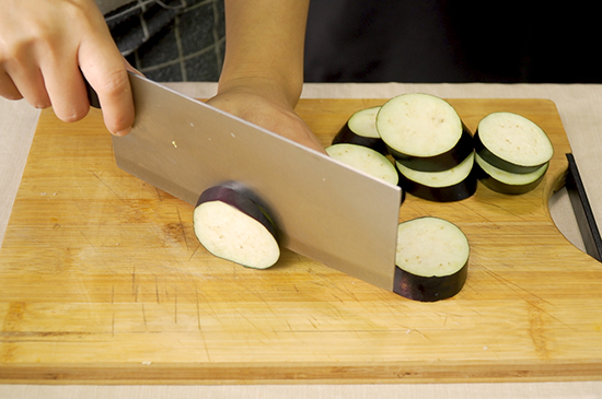 2、茄片横切一刀分成两片,但不完全切断,之后再肉馅塞在茄片中间合上。