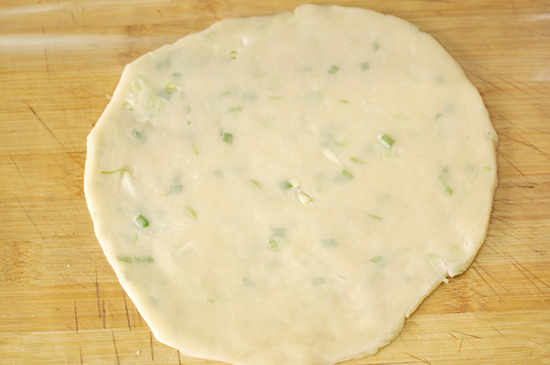 4、起锅刷一层油烧热,将醒发好的面饼放在上面中小火烙至两面金黄,美味的葱油饼就做好了。