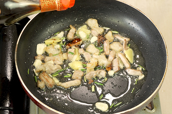 2、起锅烧油,油热后倒入五花肉小火炒至金黄,再放入葱、姜、蒜、八角炒出香味。