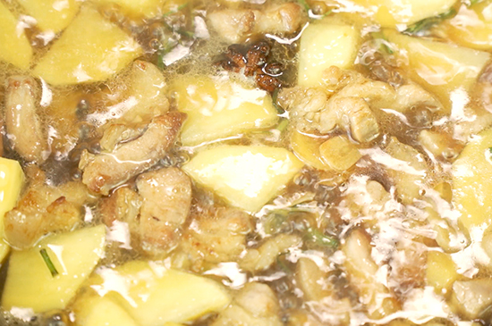 3、之后转小火,依次加入白糖、老抽、生抽、盐翻炒均匀,再加入土豆翻炒片刻。