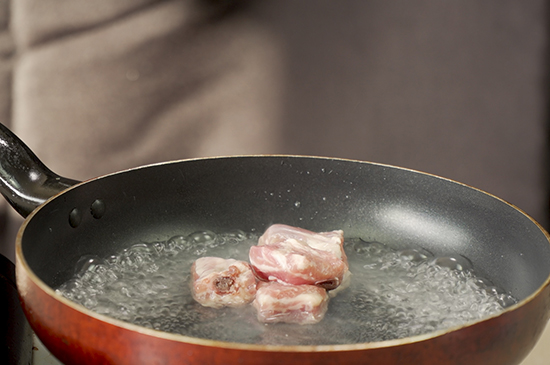 2、起锅烧水,水烧开后放入排骨、料酒焯去血水,再捞出洗净备用。