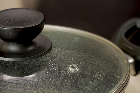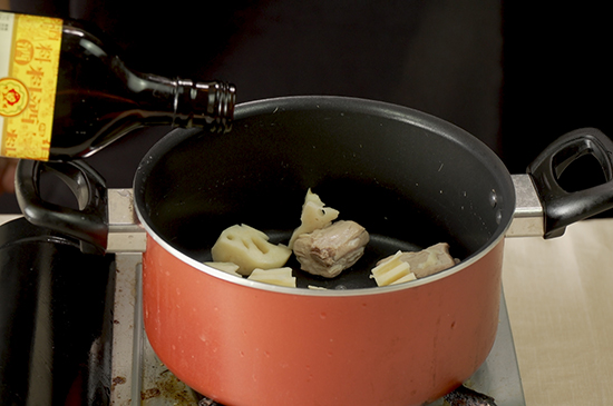 3、排骨、莲藕块、料酒和适量水放入锅内大火煮开,再转小火慢炖。