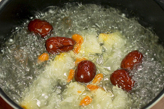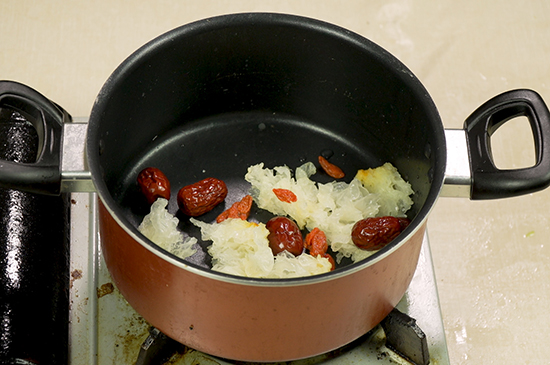 3、将银耳、红枣和枸杞放入锅内,加适量水煮开后转小火慢煮1小时。