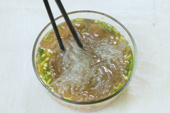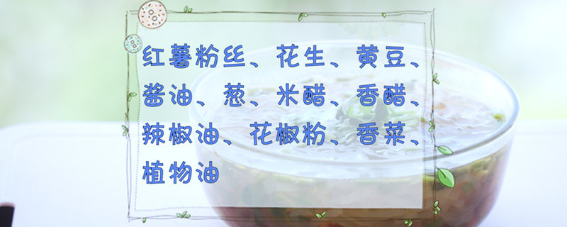 准备食材:红薯粉丝、花生、黄豆、酱油、葱、米醋、香醋、辣椒油、花椒粉、香菜、植物油。