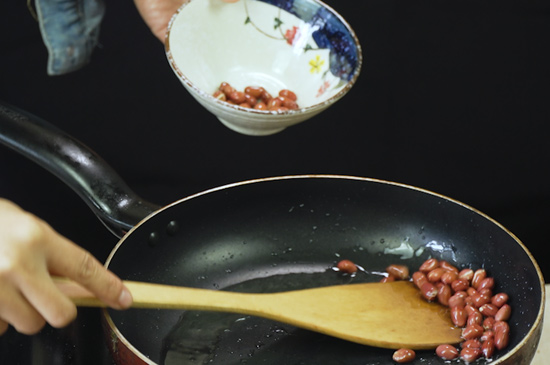 2、起锅烧油,油热后放入花生炒酥捞出,再倒入黄豆炒酥备用。