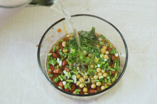 3、酱油、米醋、香醋、花生、黄豆、葱花、香菜、辣椒油、花椒粉、高汤和开水倒入大碗内调匀成汤汁。