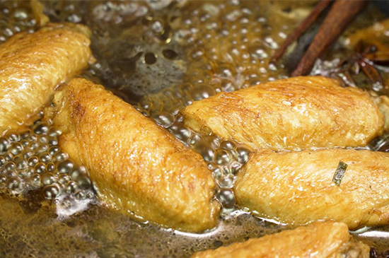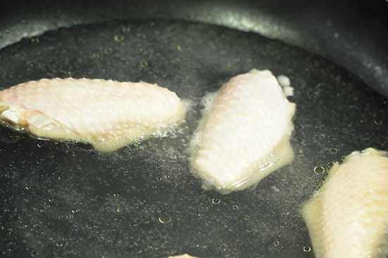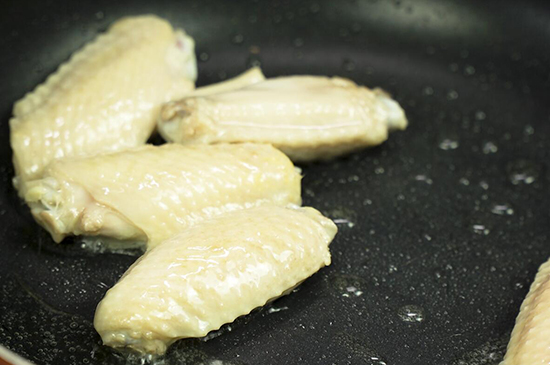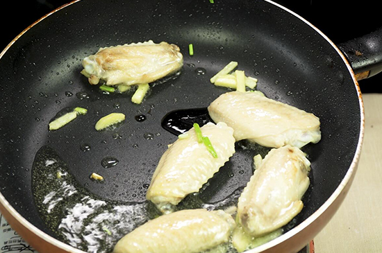 2、起锅烧油后,把鸡翅倒入锅内迅速掂锅翻炒均匀并煎炸几分钟。