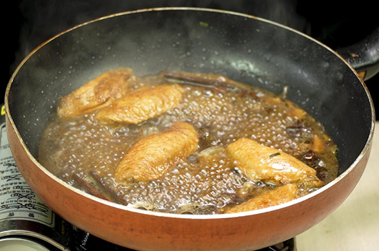 起锅烧油倒入鸡翅迅速掂锅翻炒均匀煎炸几分钟后,放入葱姜翻炒均匀,再倒入老抽和生抽调味上色,加入开水没过鸡翅,放入八角和桂皮大火烧开转中火煮制,汤汁变浓稠后加入冰糖翻炒至融化,美味的红烧鸡翅就完成了。