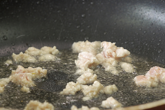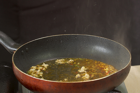 2、起锅烧油,油热后倒入肉末炒至发白,再加入葱、姜、豆瓣酱和料酒翻炒均匀。