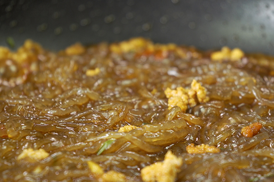 3、往锅内加入适量清水至刚好没过的肉末,再把泡好的粉丝倒入。