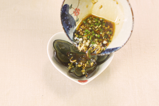 4、最后将料汁淋在皮蛋上,美味的凉拌皮蛋就做好了。