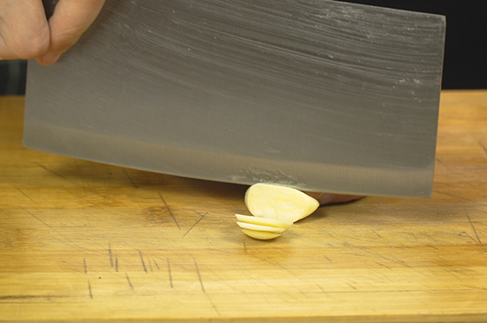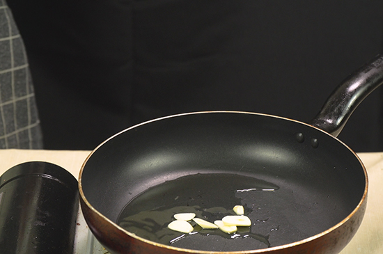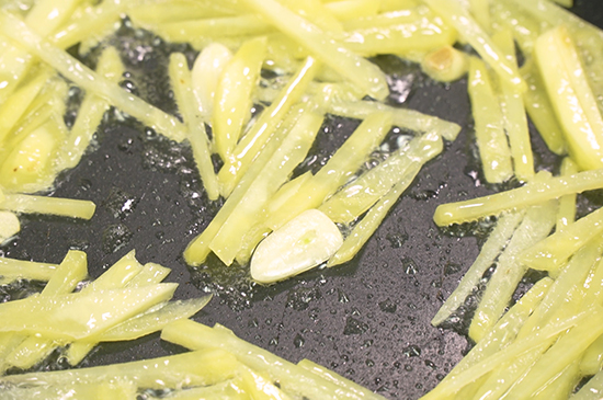 2、起锅烧油,油热后放入蒜瓣炒出香味,再加入土豆丝快速翻炒。