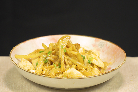 4、出锅前调入适量鸡精炒匀、撒上葱花,美味的咸鸭蛋炒土豆丝就做好了。