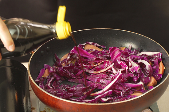 3、往锅内加入甘蓝菜、盐、醋和水翻炒均匀。