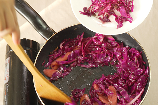 起锅烧油放入葱花、姜末、花椒和火腿肠炒出香味后,往锅内加入甘蓝菜、盐、醋和水翻炒均匀,甘蓝菜炒至断生后,出锅装盘,美味的家常炒甘蓝菜就完成了。